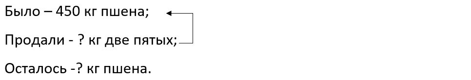 Краткое условие: В магазине было 450 кг пшена, за день продали две пятых. Сколько килограммов пшена продали за день?