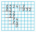 1. Делю сотни. 65 сотен – это первое неполное делимое. Неполное частное чисел 65 и 7 равняется 9 – столько сотен будет в частном. Умножу 9 на 7, получу 63 – столько сотен разделили. Вычту 63 из 65, получу 2 – столько сотен осталось разделить. Сравню остаток с делителем: число оставшихся сотен меньше, чем 7.