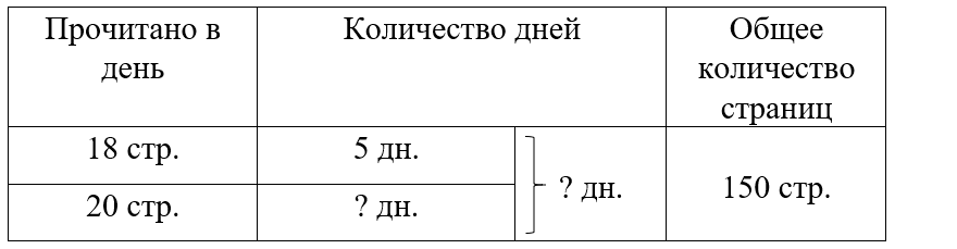 Краткое условие: В повести 150 страниц. Первые 5 дней ученик читал по 18 страниц, затем — по 20 страниц в день. За сколько дней он прочитал повесть?