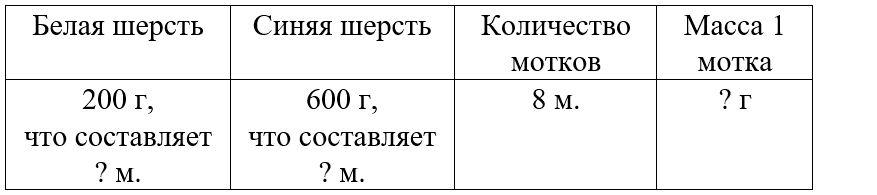 Краткое условие: Бабушка купила 200 г белой и 600 г синей шерсти, всего 8 одинаковых мотков. Узнай массу одного мотка и количество мотков каждого цвета.