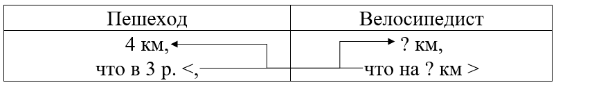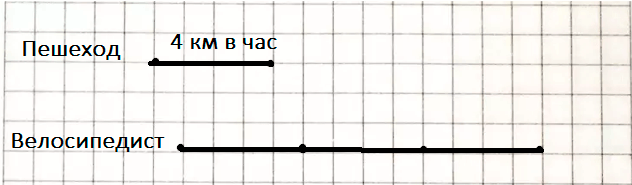 Краткое условие: Пешеход идёт 4 км/ч, это в 3 раза меньше скорости велосипедиста. На сколько км/ч велосипедист быстрее пешехода? Сделай чертёж и реши.