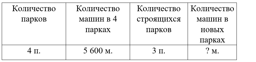 Краткое условие: В городе 4 парка с 5 600 машинами. Строят ещё 3 таких же. Сколько машин будет в новых парках, если везде поровну?