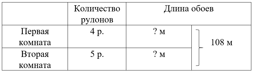 2) 108 : 9 = 12 м – длина 1 рулона обоев
