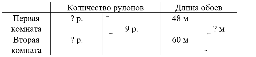 Краткое условие: Чем похожи и чем различаются задачи и их решения? 1) На две комнаты ушло 108 м обоев: на одну — 4 рулона, на другую — 5 рулонов. Сколько метров ушло на каждую? 2) На две комнаты ушло 9 одинаковых рулонов: на одну — 48 м, на другую — 60 м. Сколько рулонов ушло на каждую?