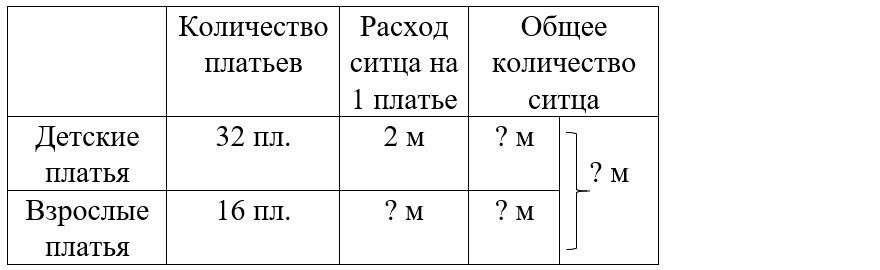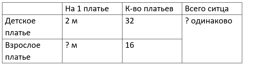 Краткое условие: Из куска ситца можно сшить 32 детских или 16 взрослых платьев. На детское платье идёт 2 м. Сколько метров идёт на взрослое?