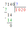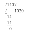 2. Делю десятки. Неполное частное чисел 2 и 7 равняется 0 – столько десятков будет в частном. Умножу 0 на 7, получу 0 – столько десятков разделили. Вычту 0 из 2, получу 2 – столько десятков осталось разделить.