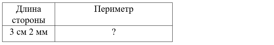 Краткое условие: Найди периметр квадрата со стороной 3 см 2 мм.