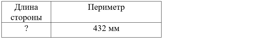 Краткое условие: Найди длину стороны квадрата, периметр которого равен 432 мм.