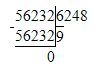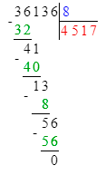 4. Делю единицы. Подумаем, какое двузначное число с 5 десятками делится на 8 без остатка. Частное чисел 56 и 8 равняется 7. Значит, на месте единиц в делимом необходимо писать цифру 6, а в разряде единиц частного – цифру 7. Произведение чисел 7 и 8 равняется 56 – столько единиц разделили. Вычту 56 из 56, получу 0 – единицы разделили все.