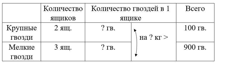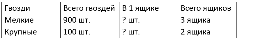 Краткое условие: Купили 900 мелких и 100 крупных гвоздей. Мелкие разложили в 3 ящика поровну, крупные — в 2 ящика поровну. На сколько больше гвоздей в одном ящике с мелкими, чем с крупными?