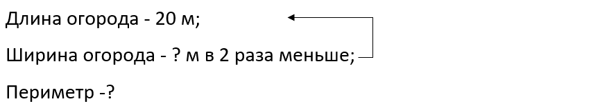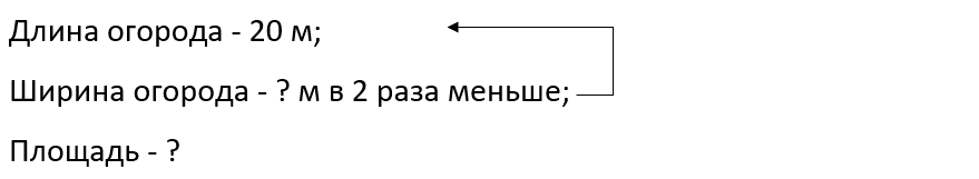 Краткое условие: Длина прямоугольного огорода 20 м, ширина в 2 раза меньше. 1) Сколько метров сетки нужно для ограждения? 2) Найди площадь огорода.