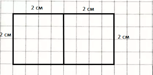 Краткое условие: Из двух квадратов со стороной 2 см сложили прямоугольник. Сделай чертёж, найди периметр и площадь.