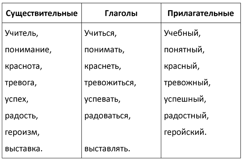 Слова, которые имеют общие корни: учитель, учиться, учебный; понимание, понимать, понятный; краснота, краснеть, красный; тревога, тревожиться, тревожный; успех, успевать, успешный; радость, радоваться, радостный; героизм, геройский, героически; выставка, выставлять.