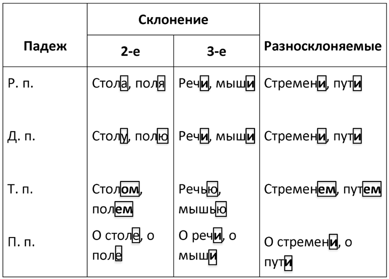 Сравнение окончаний разносклоняемых существительных и существительных 2-ого и 3-ого склонений