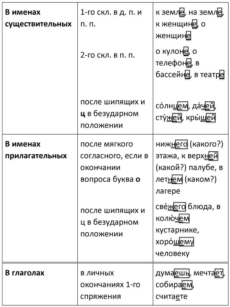 Составьте таблицу «Буква е в окончаниях слов изученных частей речи». Заполните её примерами.