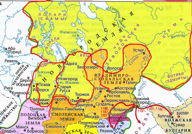Новгород и Владимиро-Суздальская земля формально возглавлялись князем, однако в Новгороде княжеская власть была ограничена и основное управление осуществлялось вече, посадником и главой церкви. Во Владимиро-Суздальской земле княжеская власть была основной. Все управление шло от князя, он был главой светским и религиозным.