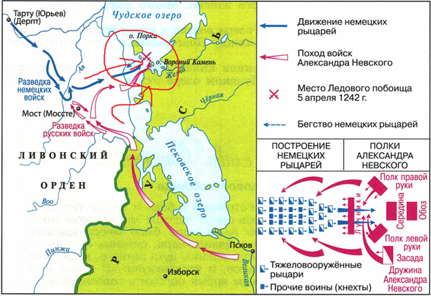 В битве на Чудском озере Александр Невский применил известный с античных времен прием ослабления центра для захода флангов по бокам.