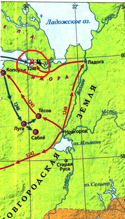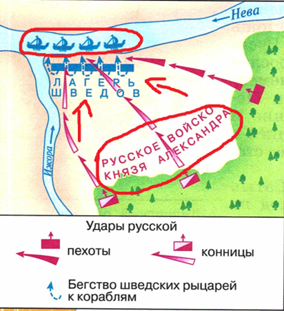 В Невской битве, где Александр Невский одержал победу над шведами, войска были организованы так, чтобы конница шла на сам лагерь, а отдельная часть пехоты отрезала шведов от их кораблей. За счет этого, смятение шведских войск усиливалось, а их силы разделялись, что и привело к победе войск Александра Невского.