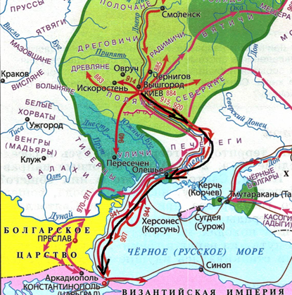 Князь Олег совершил поход и на Киев, однако его преемники уже направлялись из Киева в сторону Черного моря и Болгарского царства.