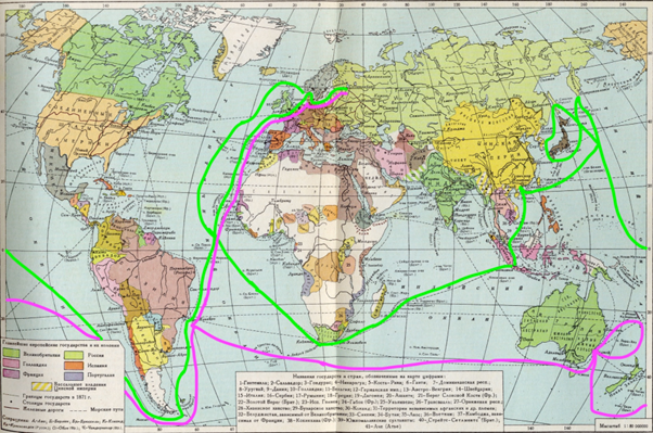 (зеленая линия – И.Ф. Крузенштерн и Ю.Ф. Лисянский;