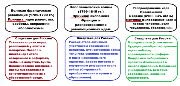 4. Влияние идей Просвещения. Среди образованной части общества и правящих кругов распространялись идеи европейского Просвещения: о правовом государстве, гражданских правах, разделении властей и необходимости реформ. Император Александр I, например, был воспитан в духе просветительских идей – это повлияло на его стремление к реформам.